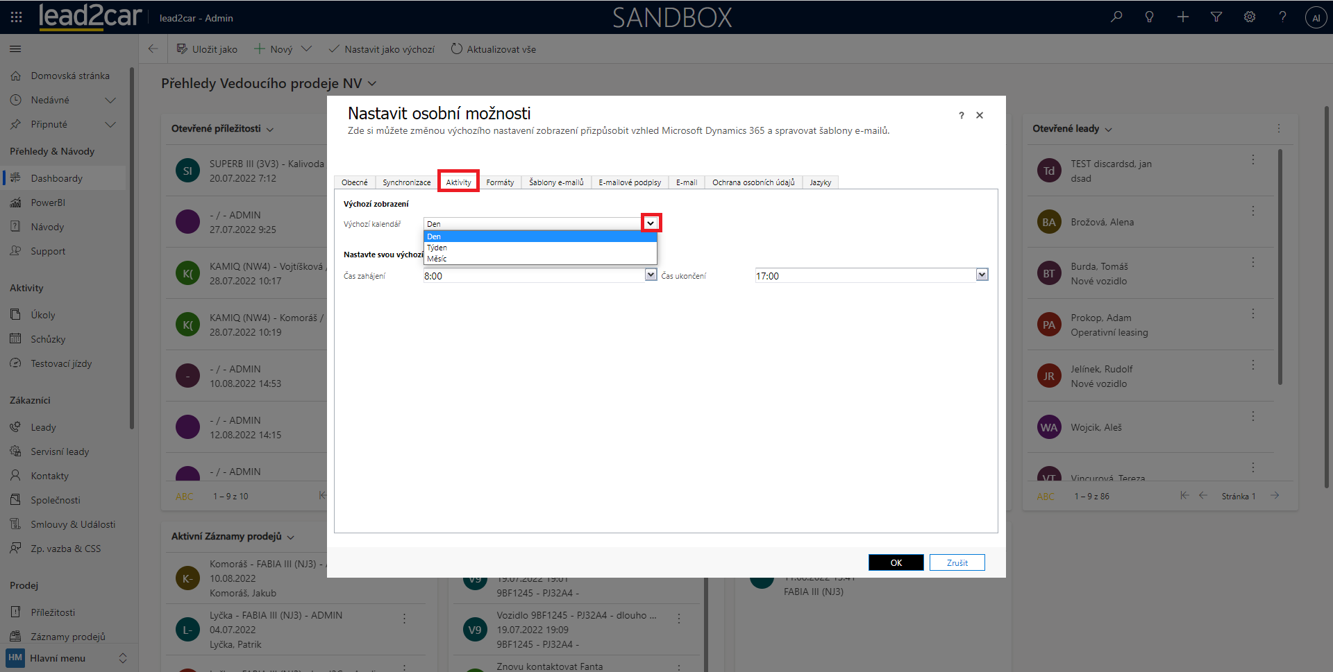 Na horním panelu je třeba kliknout na kartu aktivity. Tady se dá rozkliknout výchozí kalendář. A v tom je možné zvolit den, týden nebo měsíc. Změna je uložená kliknutím na tlačítko ok vpravo dole.