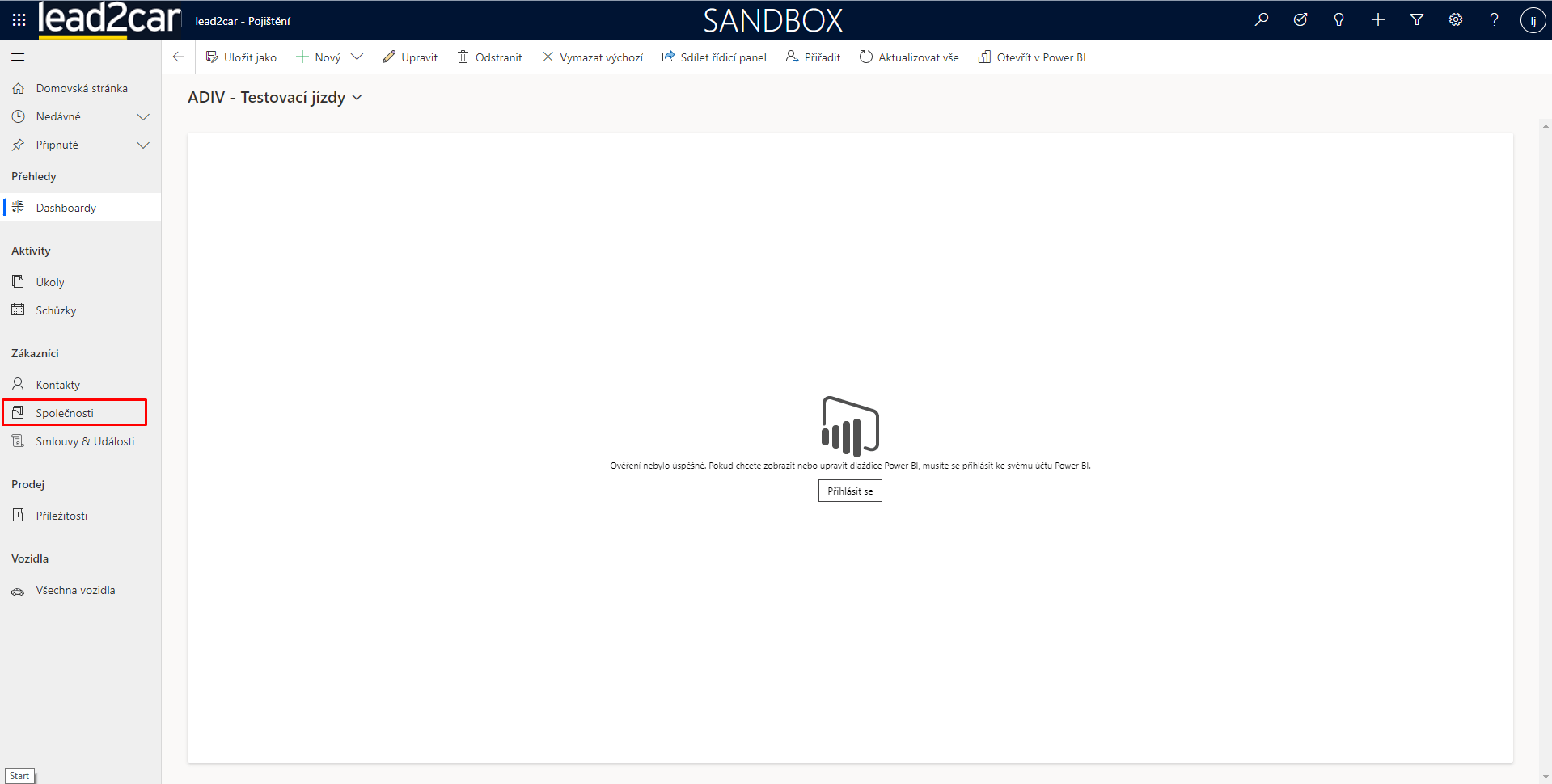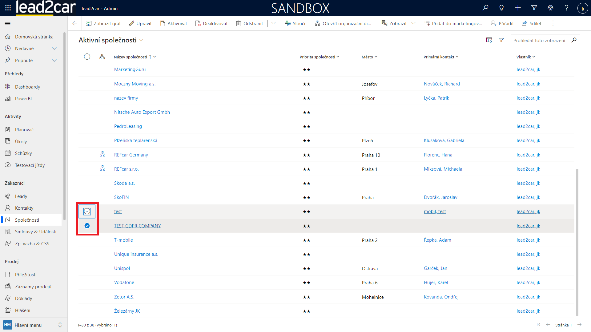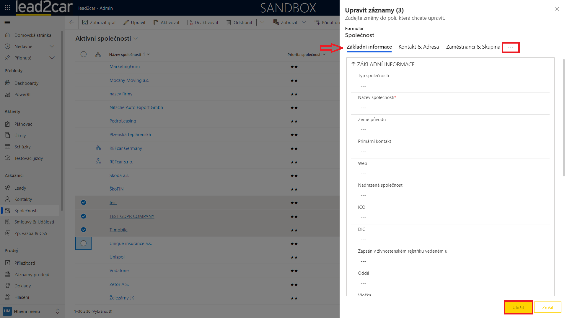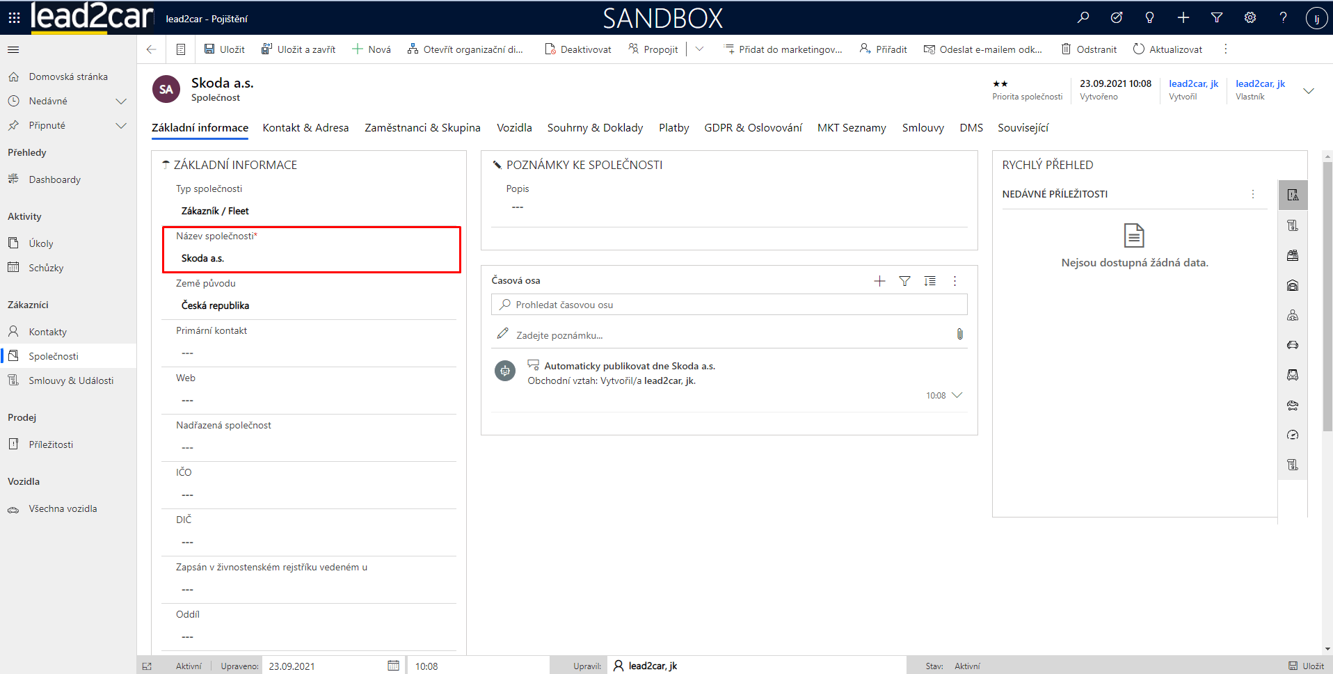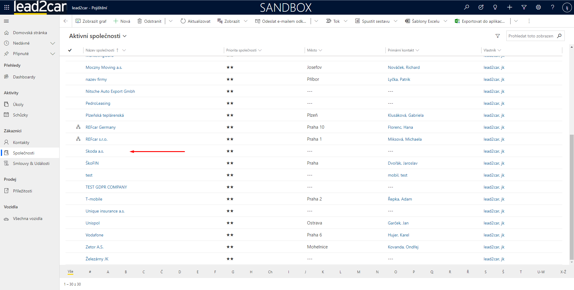 Entita "Společnosti" shromažďuje detaily o Vaších Vašich klientech - společnostech. Jsou zde nejen evidovány kontaktní údaje, ale také k nim lze přiřadit vozidla z databáze, sledovat jejich nákupy, nebo přiřadit konkrétní zaměstnance pro kontakt.