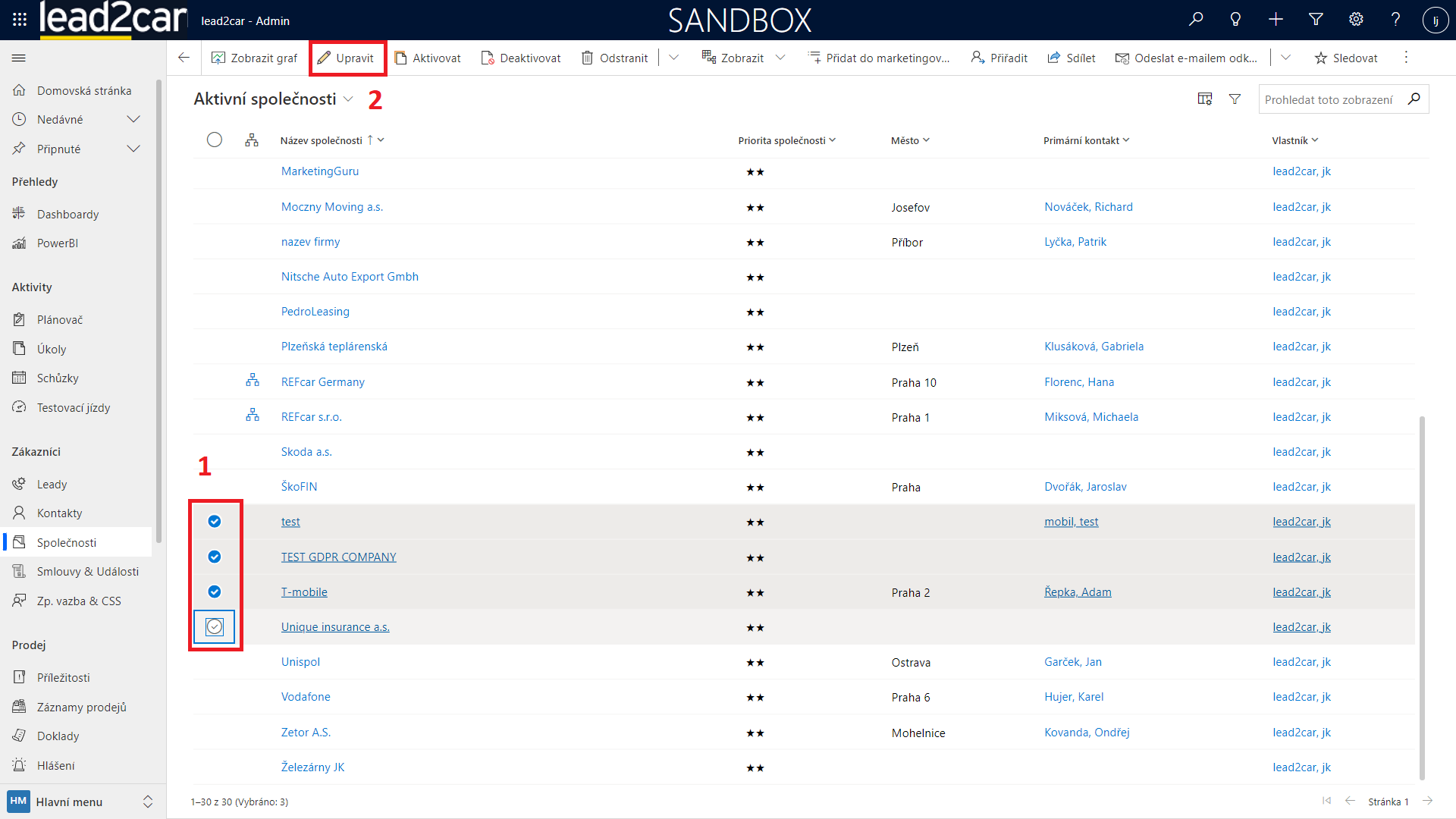Změnit informace u jednoho či více políček společnosti je možné i u více společností najednou. Pro hromadnou úpravu společností označte vlevo kliknutím do kroužku záznamy, které chcete upravit, a klikněte na tlačítko "Upravit" v horní liště.