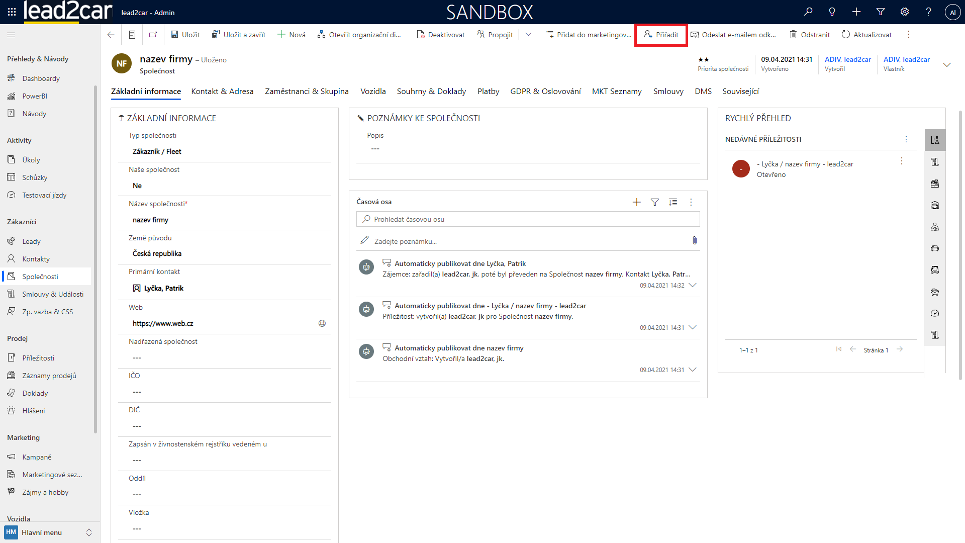 Přiřazení společnosti znamená změnu vlastníka kontaktu společnosti. Slouží pro zpřehlednění a pomáhá např. prodávajícím k efektivnějšímu řízení společností, se kterými pracují. V záznamu společnosti zvolte v horní liště možnost "Přiřadit".