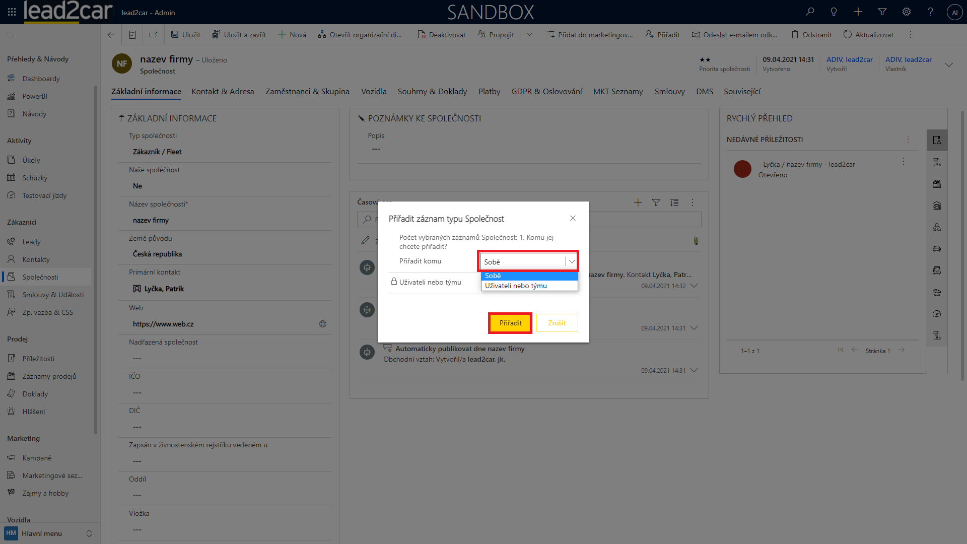 V dialogovém okně zvolte, zda chcete společnost přiřadit sobě, tedy aktuálně přihlášenému uživateli, nebo jinému uživateli nebo týmu uživatelů. Pak klikněte na tlačítko "Přiřadit".