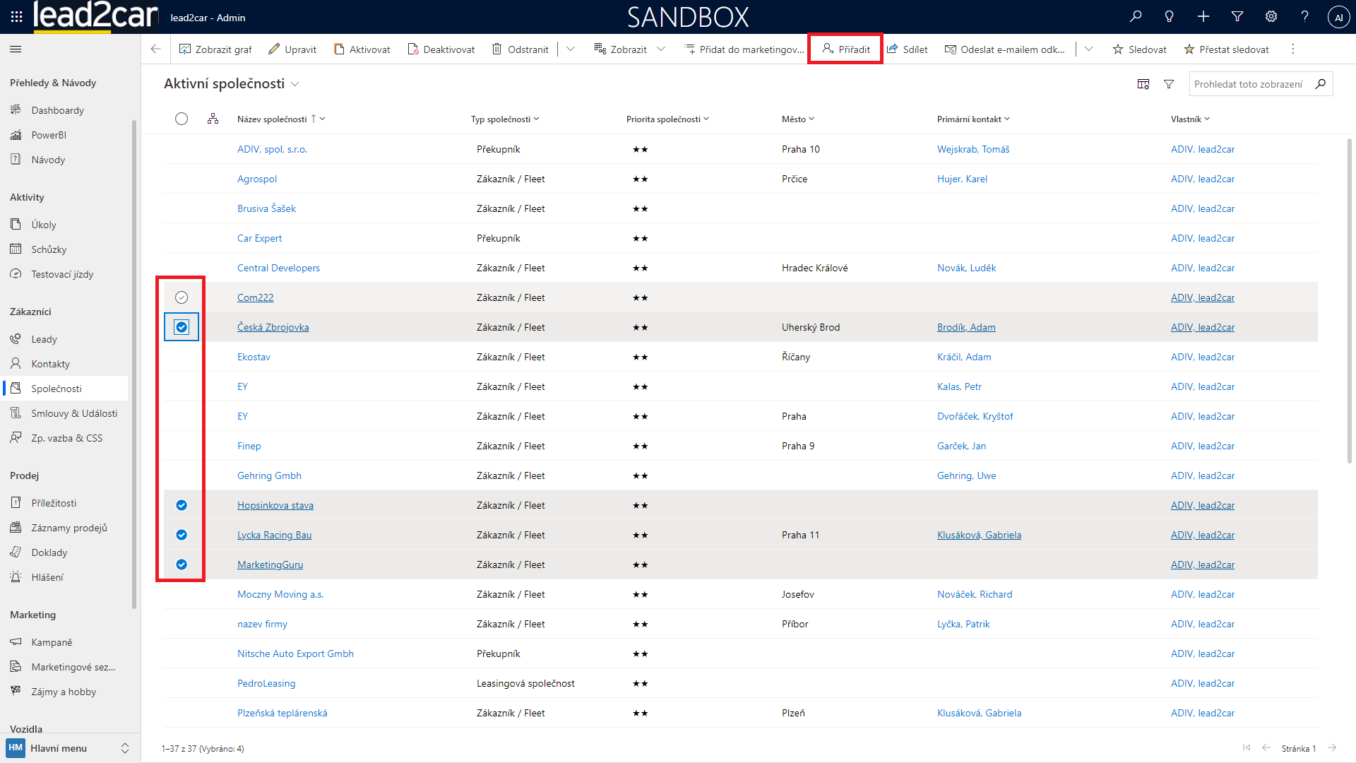 Ve zobrazení společnosti označte kontakty, které chcete přiřadit a klikněte na tlačítko "Přiřadit" v horní liště. Poté je postup stejný jako u přiřazování jednotlivých společností.
