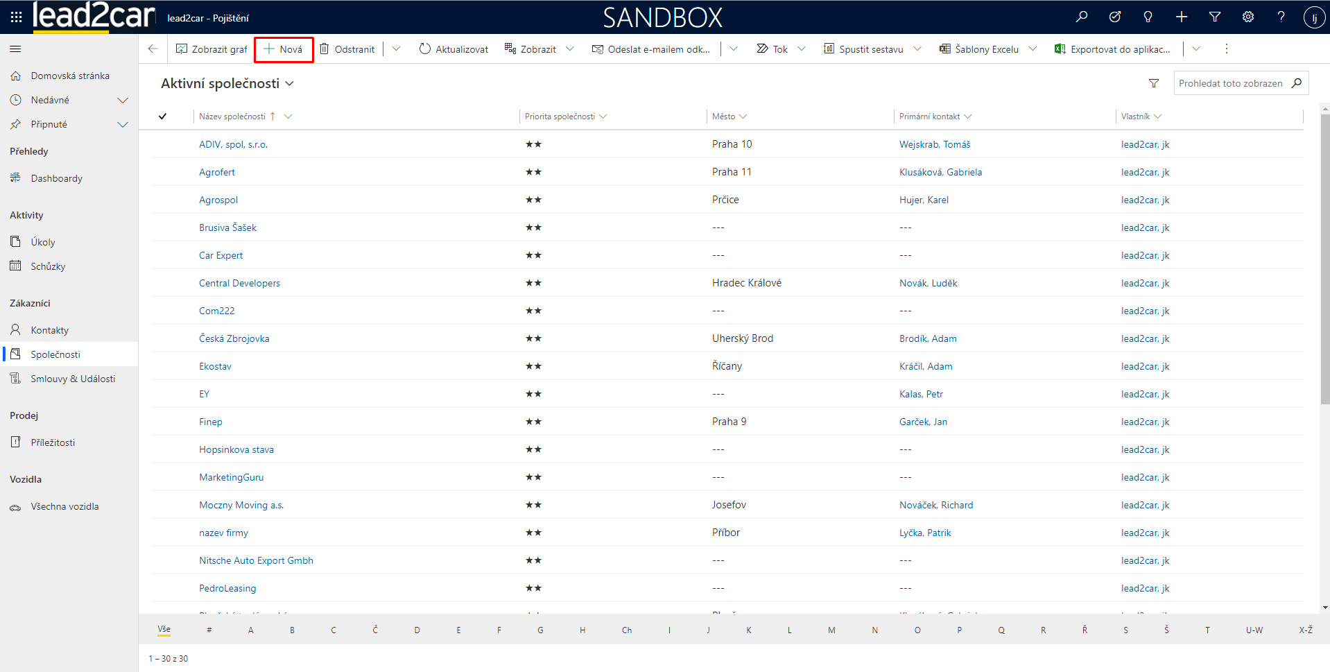Údaje o společnostech se v lead2car ukládají ručně. Pro vytvoření záznamu o společnosti vyberte z levého menu možnost "Společnosti". Následně se Vám zobrazí celý seznam společností.