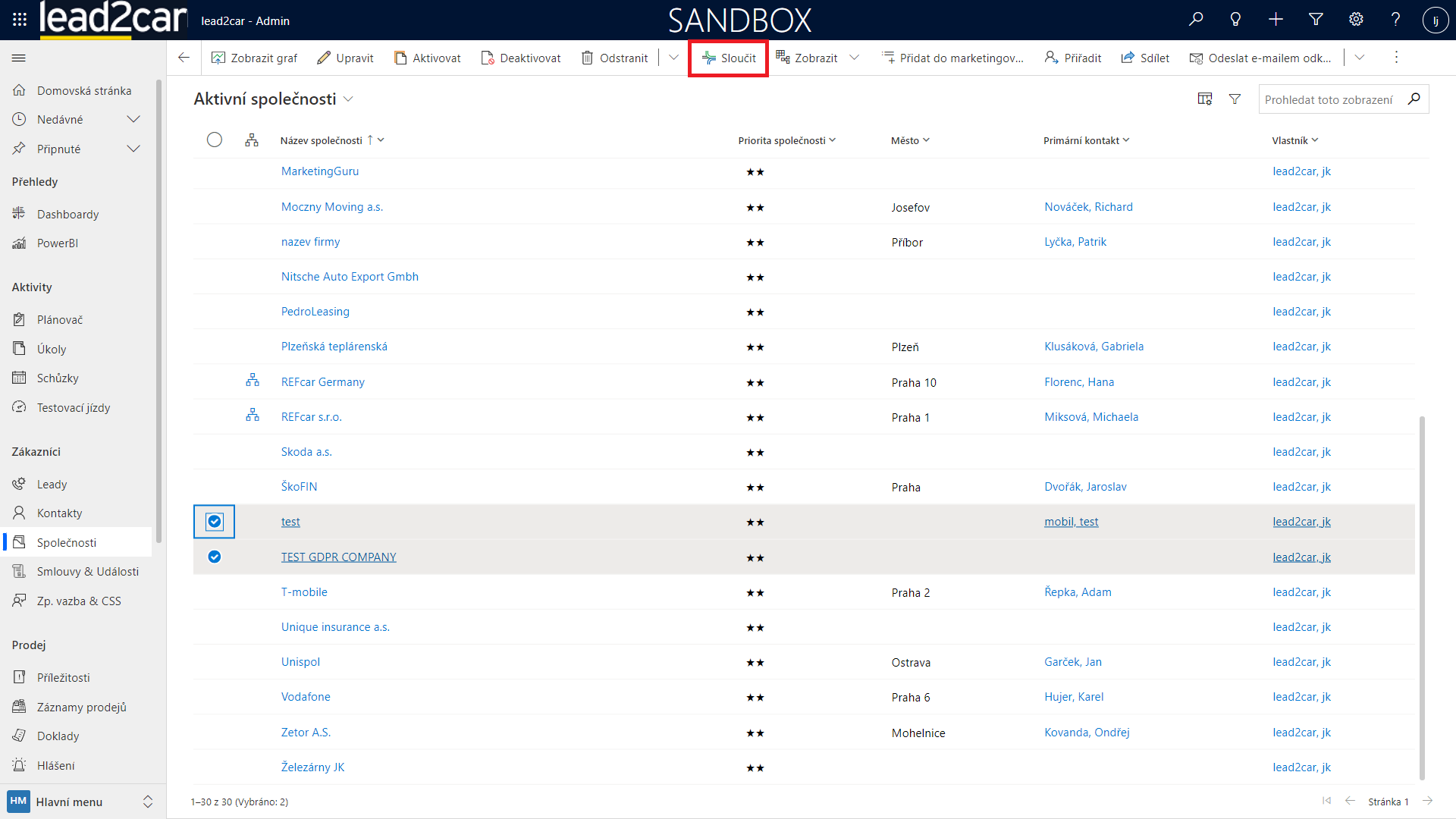 Sloučení společností vytvoří z více záznamů jeden. Je to vhodné například, když existují dva záznamy pro jednu společnost, ale s různými vypněnými informacemi. Nejdřív označte vlevo kliknutím do kroužku záznamy, které chcete sloučit.