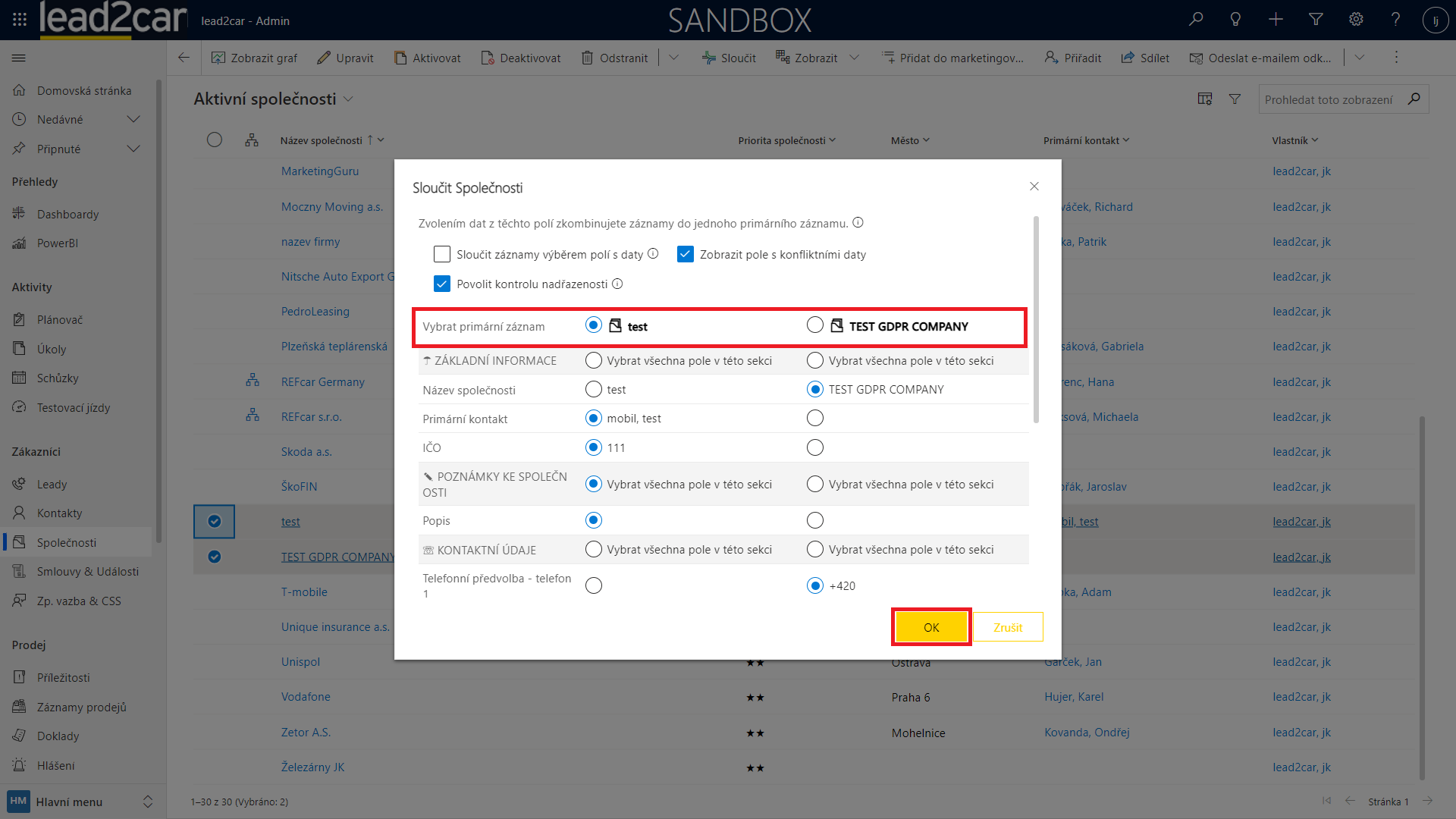 V zobrazeném okně vyberte, které detaily záznamů se mají ve sloučené společnosti zachovat. V řádku "Vybrat primární záznam" vyberte ten záznam, který bude zachován a případně upravení dle zvolených nastavení. Druhý, podřízený záznam bude po sloučení deaktivován. Po zvolení detailů sloučené společnosti klikněte na tlačítko "OK" pro vytvoření záznamu.