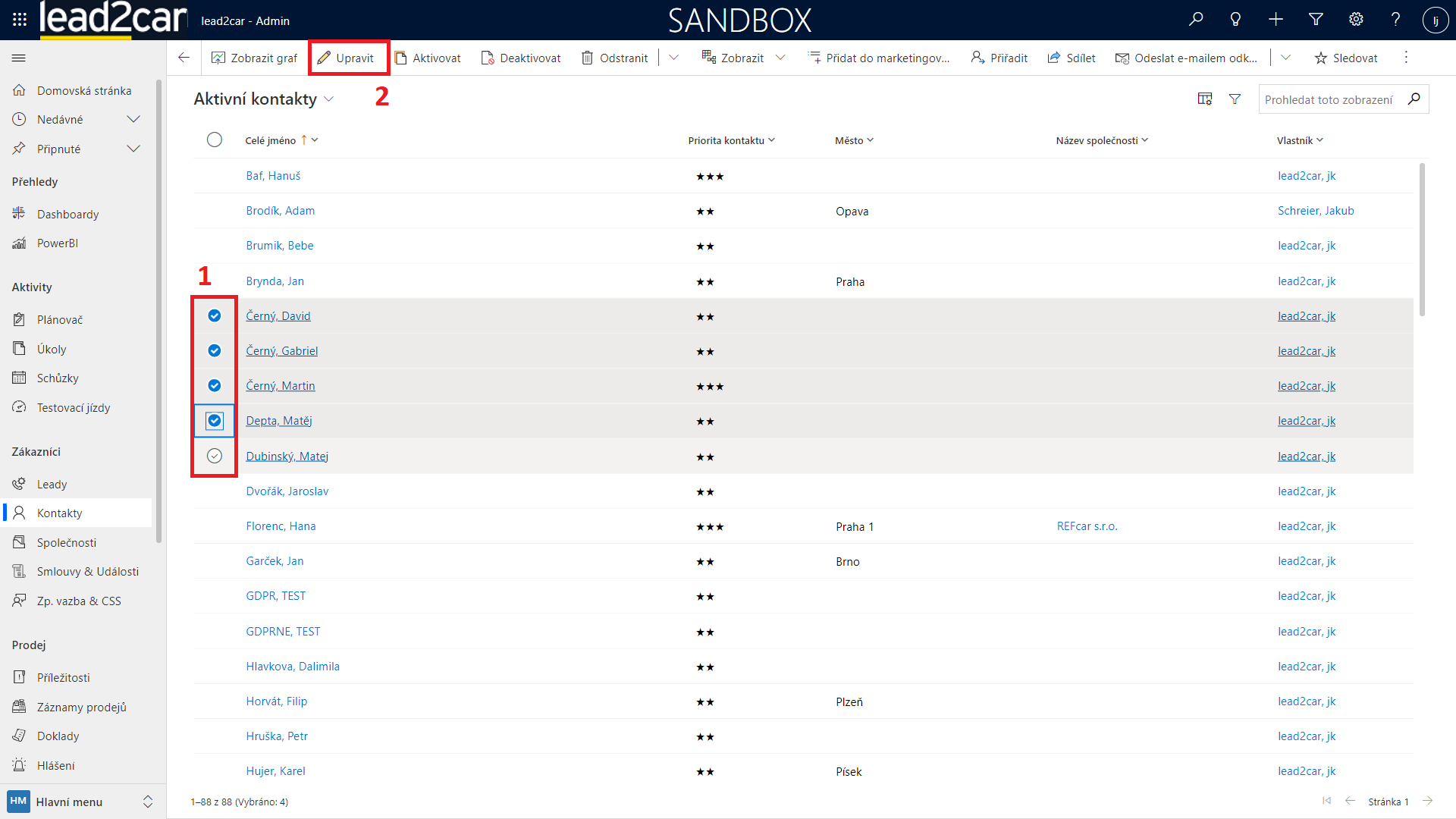Změnit informace u jednoho či více polí kontaktů je možné i u více kontaktů najednou. Pro hromadnou úpravu kontaktů označte vlevo kliknutím do kroužku záznamy, které chcete upravit, a klikněte na tlačítko "Upravit" v horní liště.