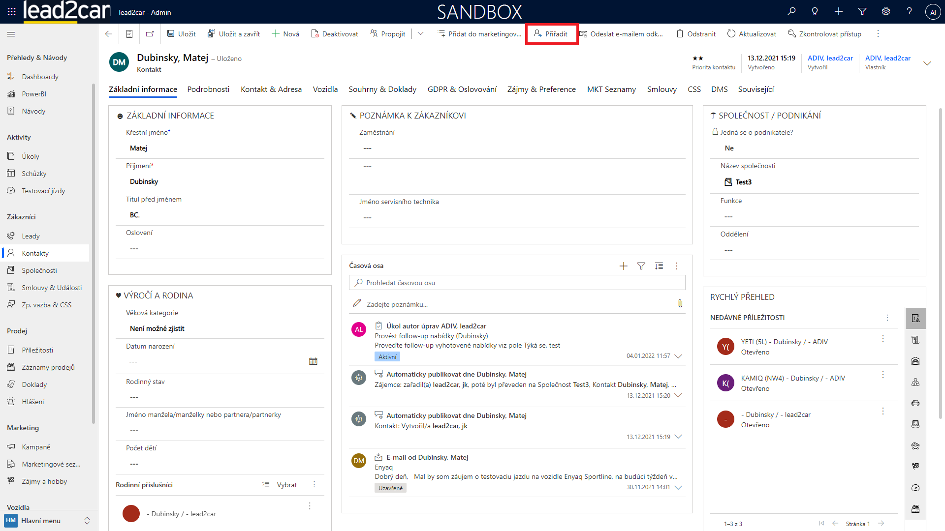 Přiřazení kontaktu znamená změnu vlastníka kontaktu. Slouží pro zpřehlednění a pomáhá např. prodávajícím k efektivnějšímu kontrolování kontaktů, s kterými reálně pracují. V záznamu kontaktu zvolte v horní liště možnost "Přiřadit".