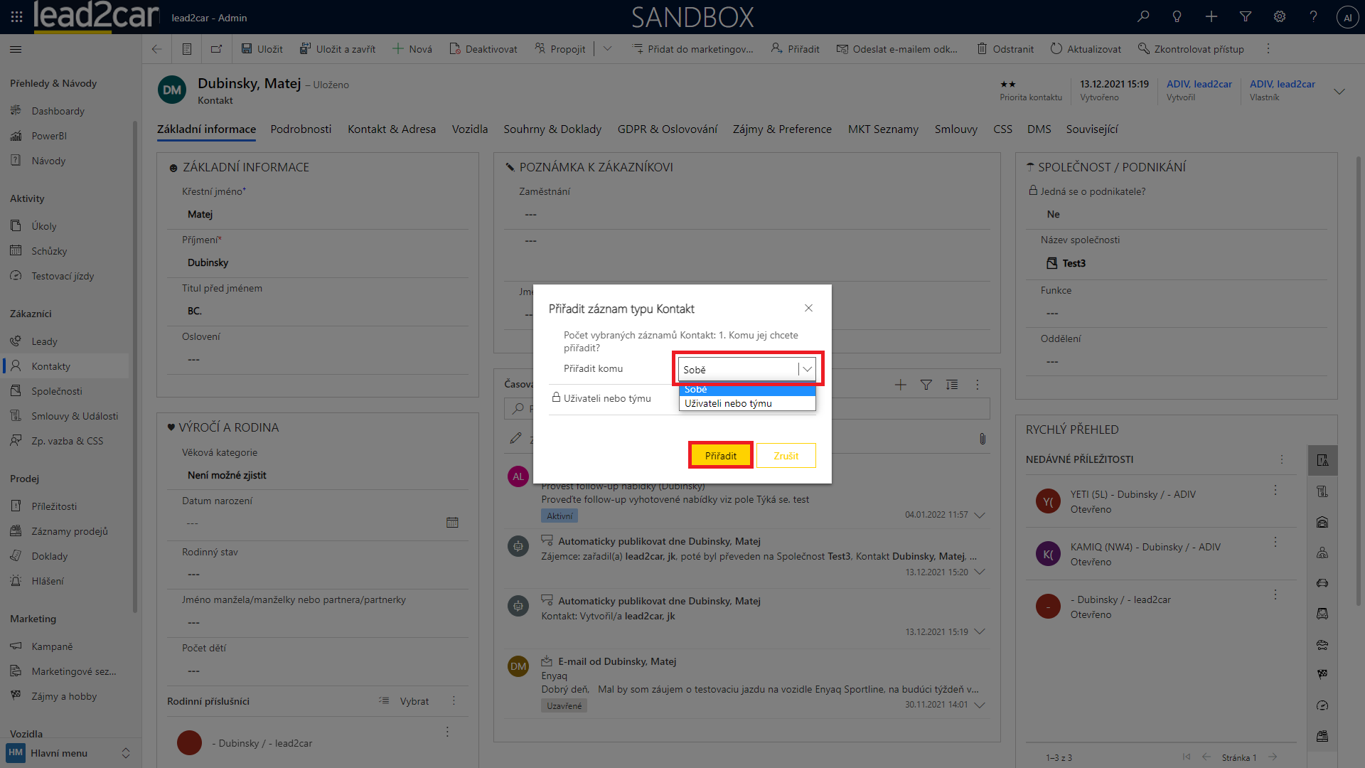 V dialogovém okně zvolte, jestli chcete kontakt přiřadit sobě, tedy aktuálně přihlášenému uživateli, nebo jinému uživateli nebo týmu uživatelů. Pak klikněte na tlačítko "Přiřadit".