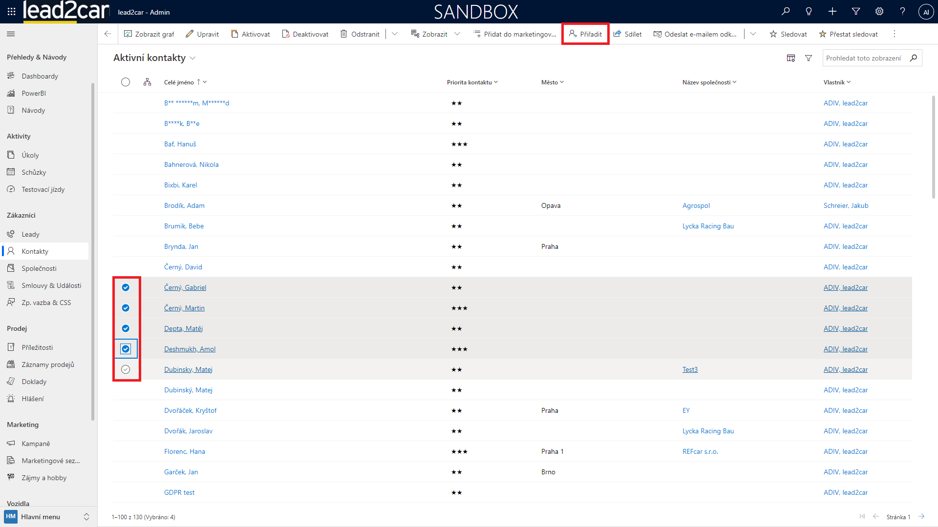 V zobrazení kontaktů označte kontakty, které chcete přiřadit a klikněte na tlačítko "Přiřadit" v horní liště. Poté je postup stejný jako u přiřazování jednotlivých kontaktů.
