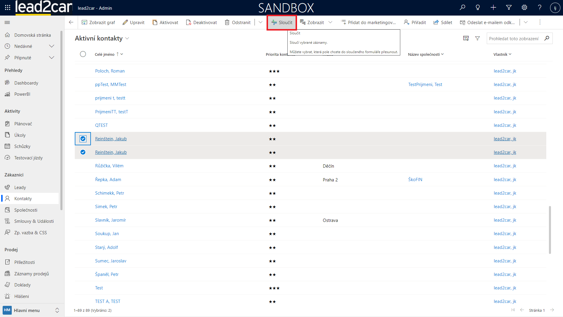 Sloučení kontaktů vytvoří z více záznamů jeden. Je to vhodné například když existují dva záznamy pro jednu osobu s různými vyplněnými informacemi. Nejdříve kontakty, které chcete sloučit, označte kliknutím vlevo do kroužku.