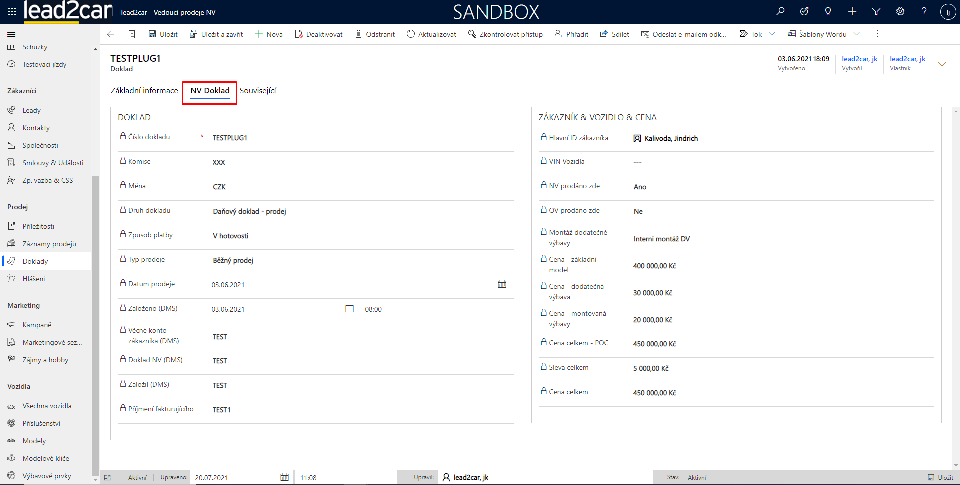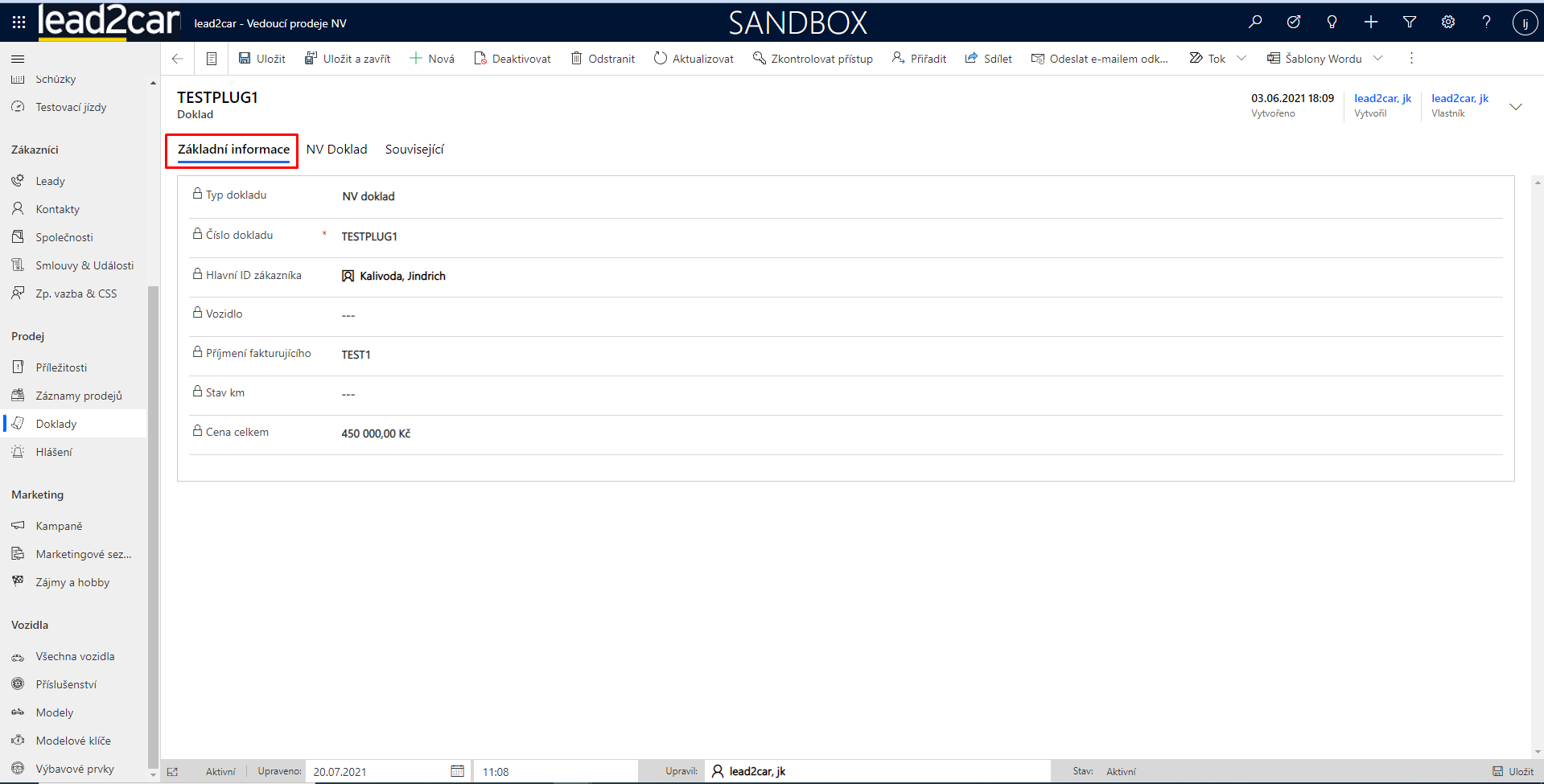 Nejdříve je třeba vyplnit, zda se jedná o doklad k novému vozidlu, ojetému vozidlu nebo servisu. Doklad bude také vázaný na konkrétního zákazníka, proto je třeba jej zvolit.