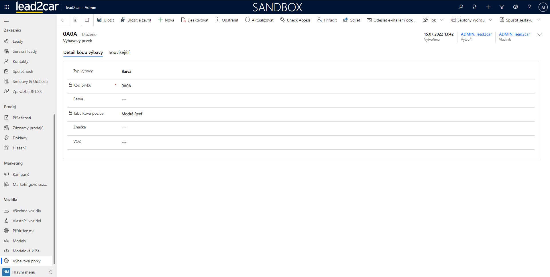Ze seznamu vyberte kliknutím na kód konkrétní prvek, o kterém chcete zjistit informace. V poli "Typ výbavy" lze určit, zda se jedná o výbavový prvek nebo barvu. Pokud bude zvolena barva, zobrazí se další pole "Barva", ve kterém lze určit, o jakou barvu se jedná. Pro zlepšení přehlednosti tak není nutné evidovat pouze kód a obchodní název barvy.