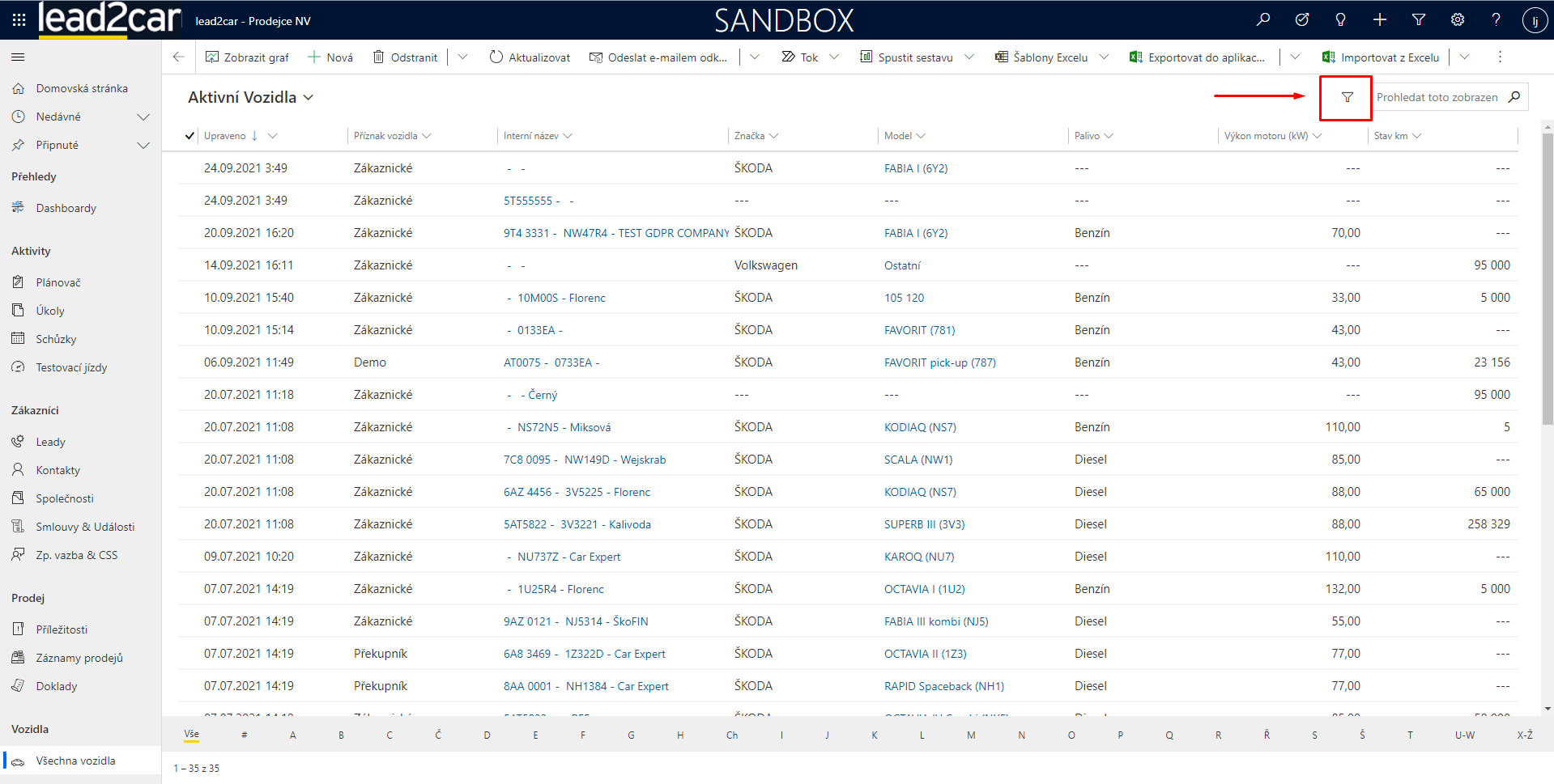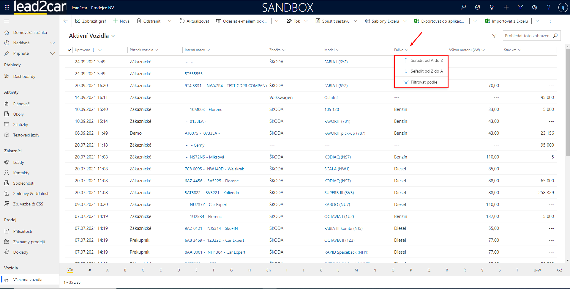 Záznamy se v lead2car dají filtrovat dvěma základními způsoby. Pokud je přímo na daném zobrazení entity pole, podle kterého chcete filtrovat, rozklikněte ikonku „šipečky dolů“ vedle názvu pole a zvolte možnost „filtrovat podle“. Poté už jen nastavíte filtr dle vašich potřeb a v zobrazení se vám ukážou odpovídající záznamy.