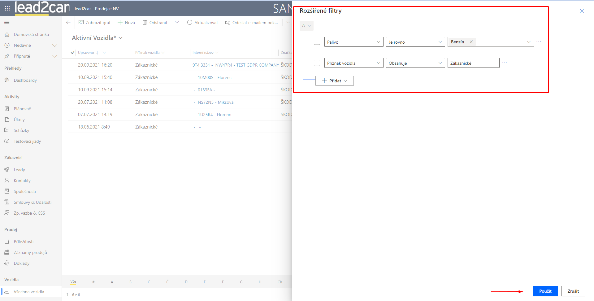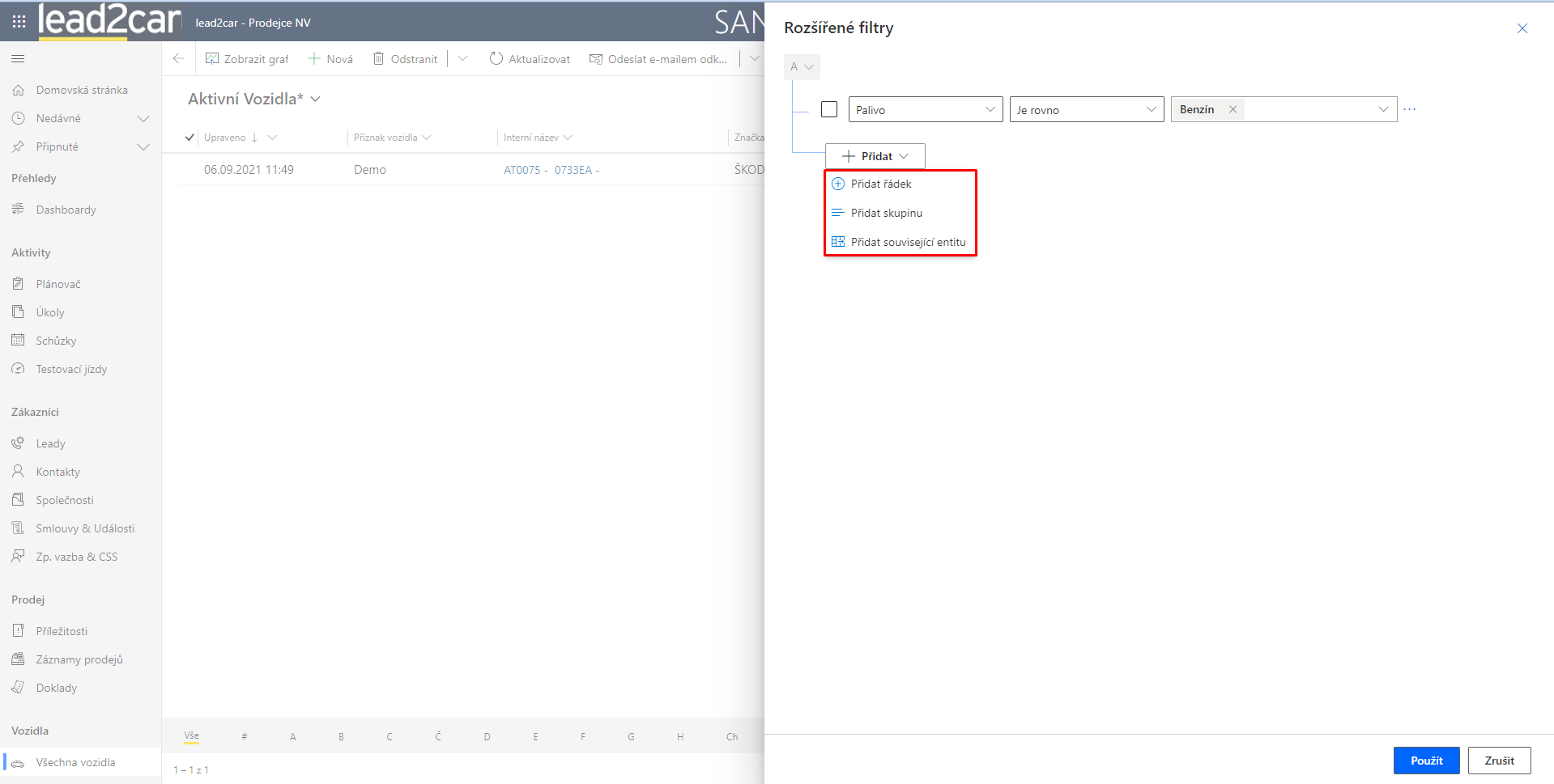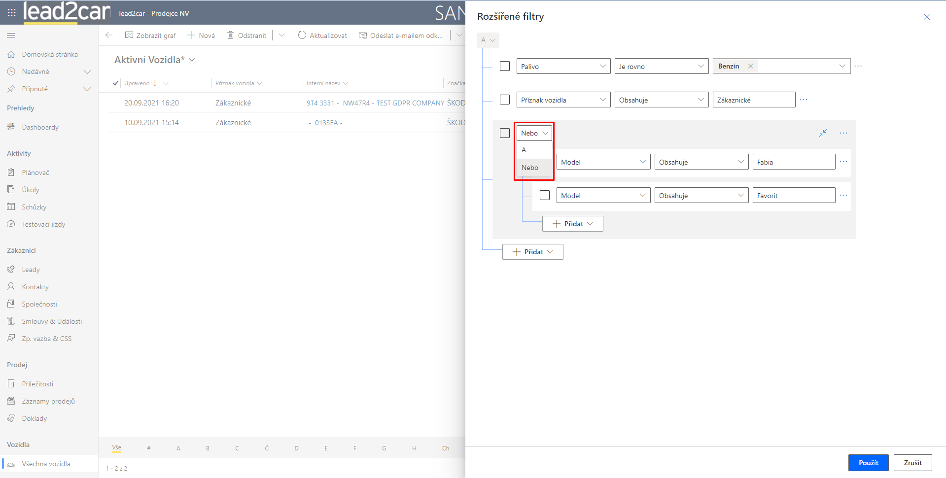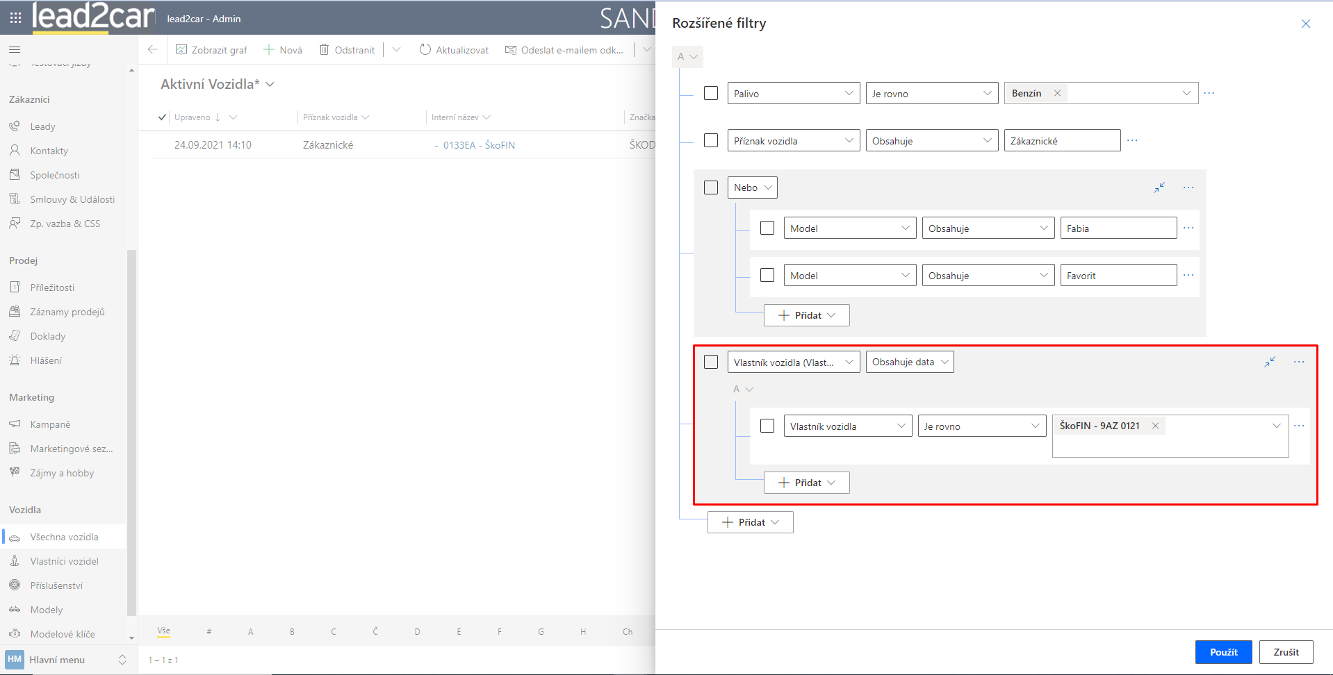 V následné ukázce je nastavena podmínka pro entitu vozidla, kde chci získat vozidla, která jsou: