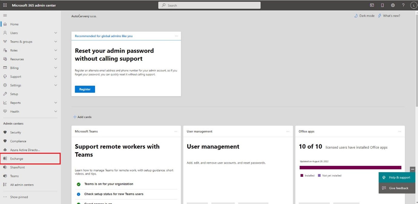 Je nutné mít otevřené Lead2car prostředí, a být tam přihlášený. Dále je možné si otevřít nové okno na stránce admin.microsoft.com. Díky otevřenému prostředí by tam dealerství mělo být automaticky přihlášené. Na této stránceklikněte v menu nalevo na "Exchange".