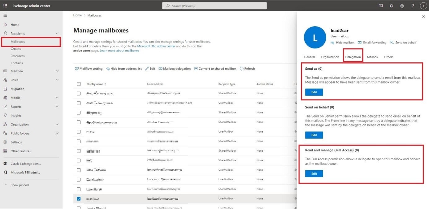 Tady si z menu nalevo rozklikněte mailboxes. Tam si můžete otevřít spravovaný email. U toho přejděte na "delegation". A tady musíte upravit pole "send as", a "read and manage". Pomocí tohu můžete členům přiřadit práva k emailům.