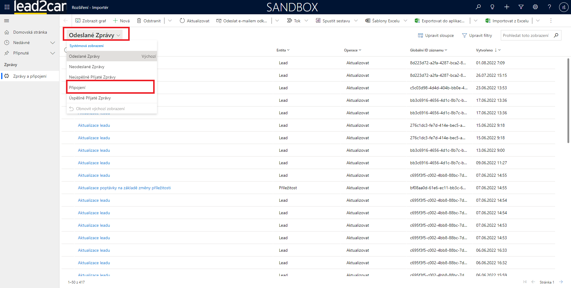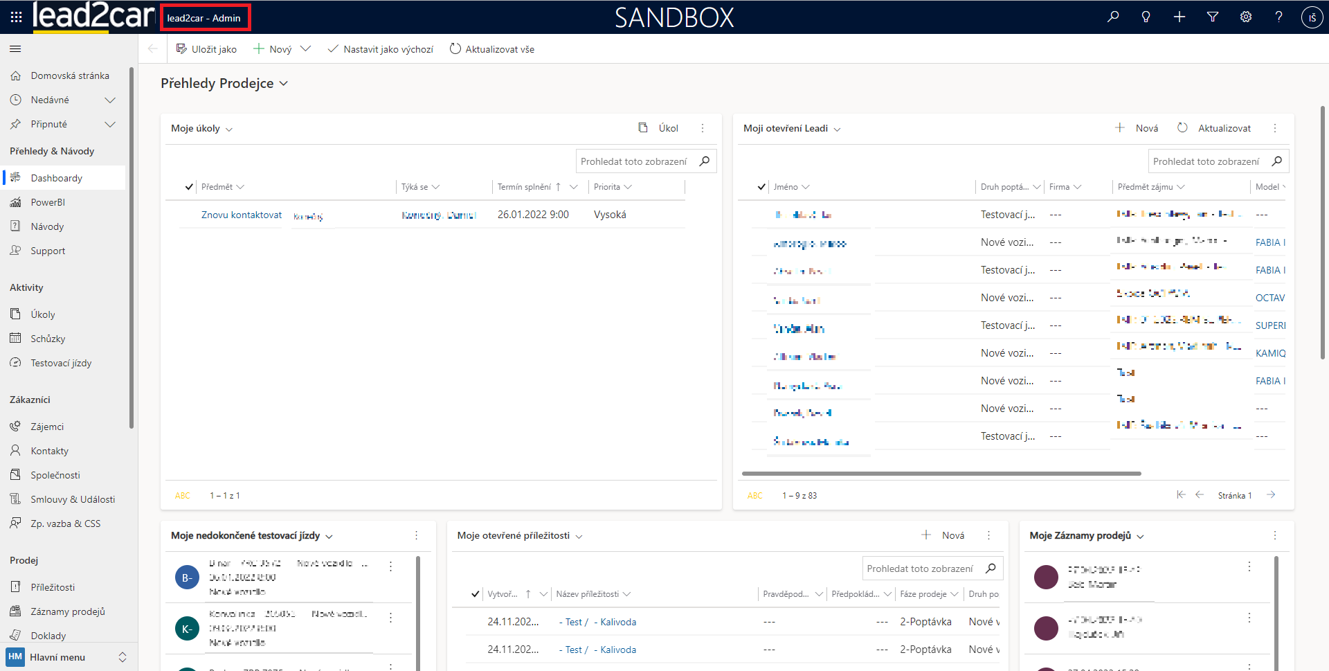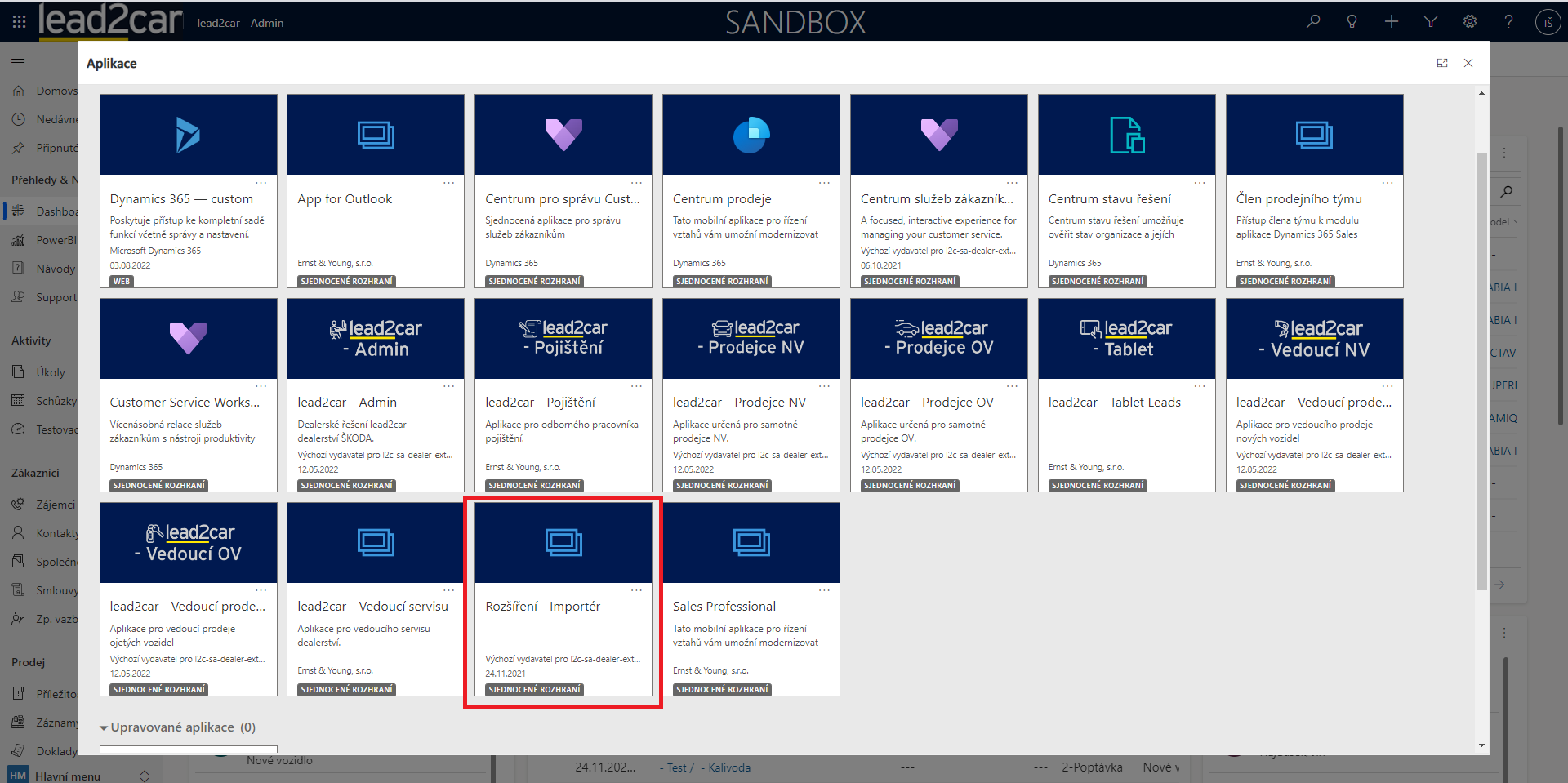 V lead2car je potřeba přepnout z admin aplikaci na jinou aplikaci. Menu se otevře pomocí kliknutí na název současné aplikace (lead2car - admin) napravo od loga Lead2car.