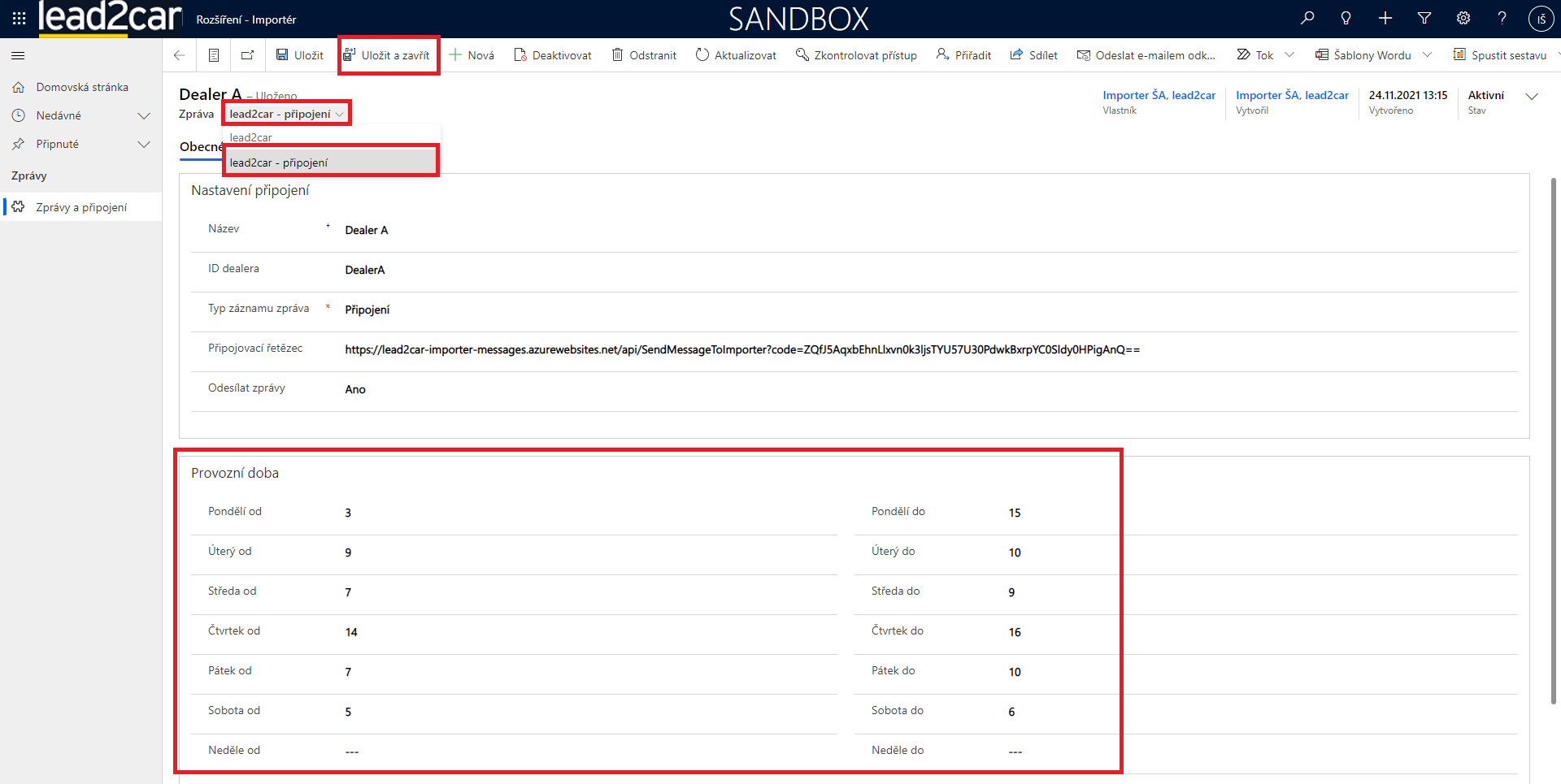 Tady už je možné pracovat s jednotlivými pobočkami. Při rozkliknutí pobočky je podstatné nejdříve změnit formulář na lead2car - připojení. Následně už je zde možné jednoduši zadat otevírací dobu dané pobočky. Na závěr stačí záznam uložit pomocí tlačítka v menu nahoře.