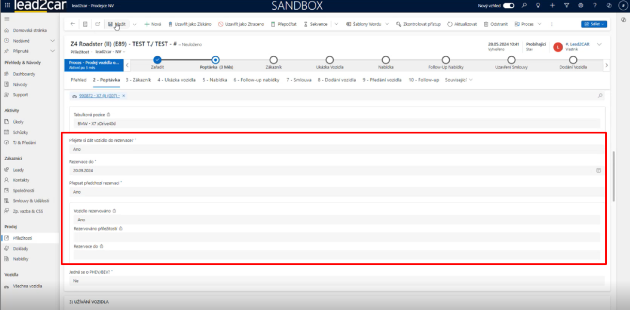 - Otevřete příležitost, ke které chcete vytvořit rezervaci. Ujistěte se, že v příležitosti je vyplněno pole „Skladové vozidlo“.