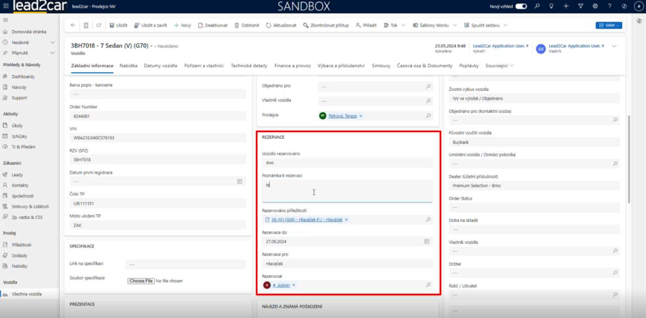 Tento návod popisuje postup, jak vytvořit rezervaci vozidla buď přímo na vozidle, nebo z příležitosti v systému Lead2Car.
