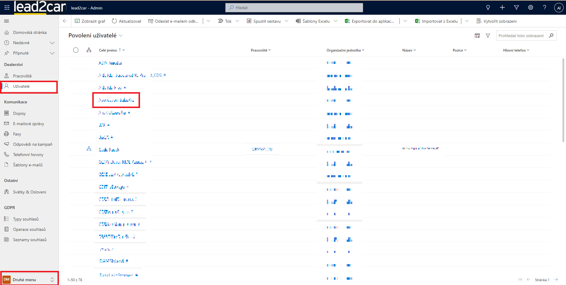 Jakožto admin můžete v kartě "uživatelé" přidávat jednotlivým uživatelům pravomoci a akce v rámci Lead2car. Například komu budou chodit emaily o jeho úkolech v Lead2car nebo na kterého uživatele budou přiřazeny záznamy o prodeji ojetých vozidel.