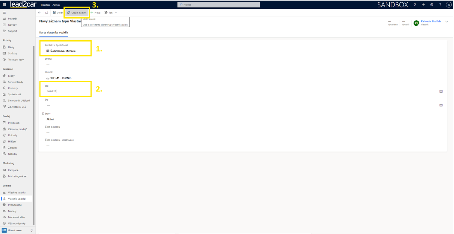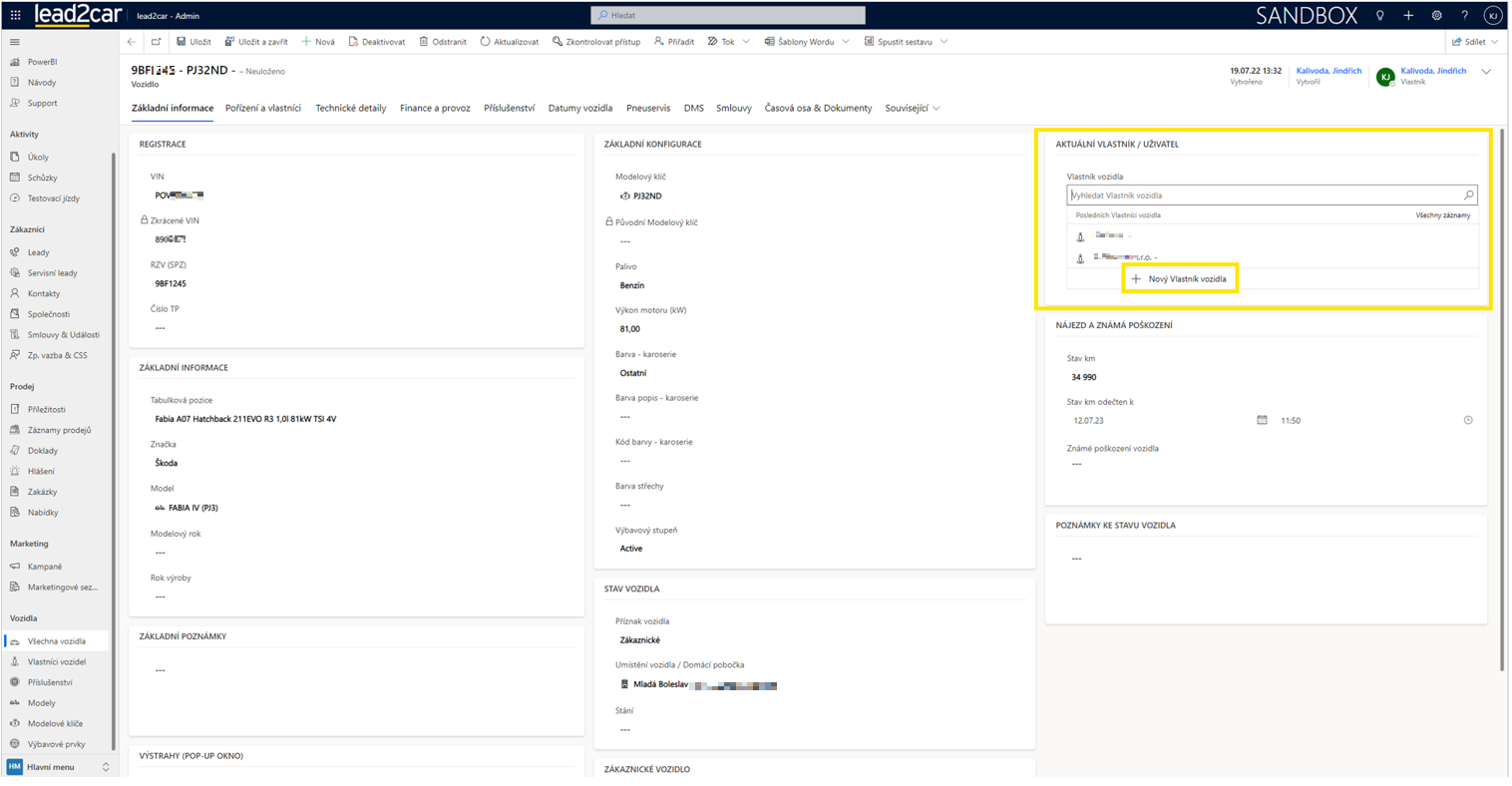 V případě, že si budete chtít zkontrolovat, že se vlastník vozidlu opravdu připsal, pak je lepší využít tlačítko Uložit a následně stisknout Aktualizovat v horní liště. Po aktualizaci formuláře by se měl nový vlastník propsat i do názvu vozidla.