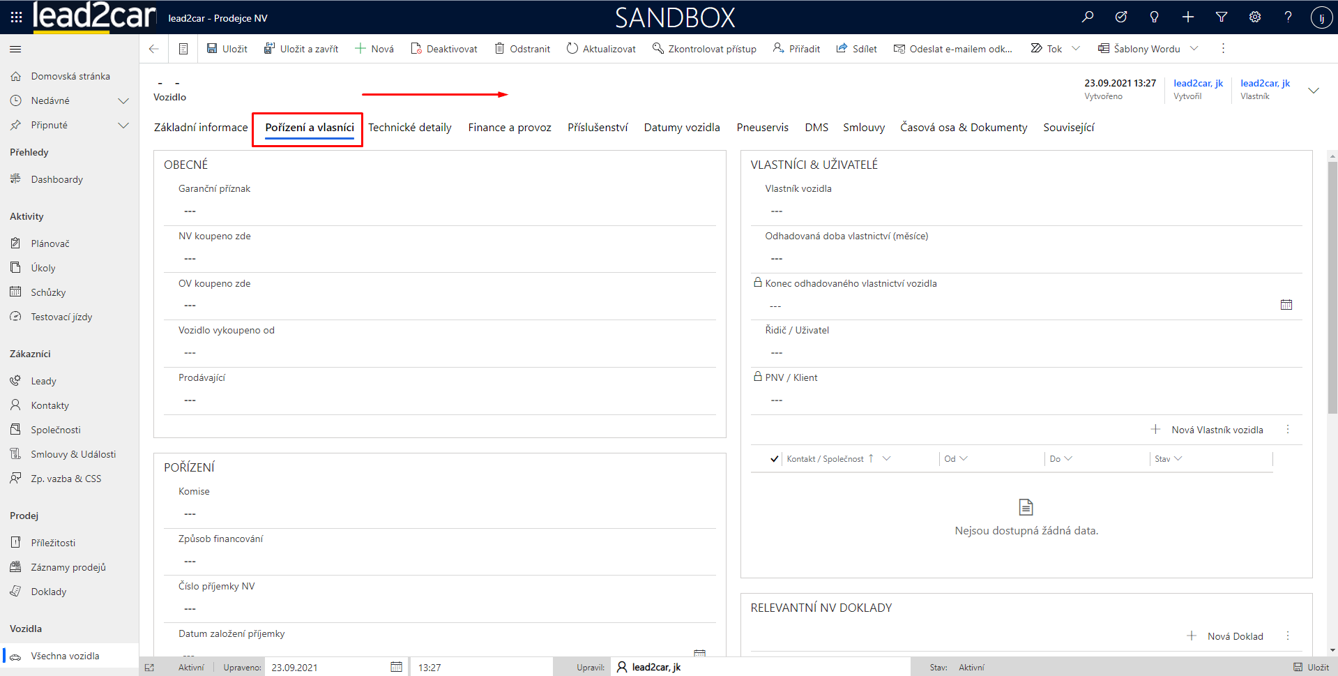 V případě vystavení dokladu na prodej vozidla mimo DMS / Helios nedojde v lead2car k automatické změně vlastníka vozidla. Pokud tato situace nastane, je třeba vlastnický vztah vytvořit ručně.