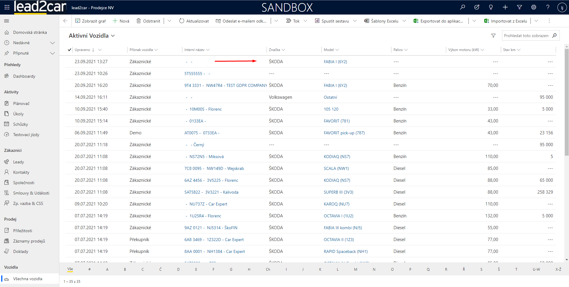Entita "Všechna vozidla" slouží jako databáze skladových vozidel nebo i těch, které již mají majitele. Zde jsou k dispozici podrobnější informace ke konkrétním vozidlům.