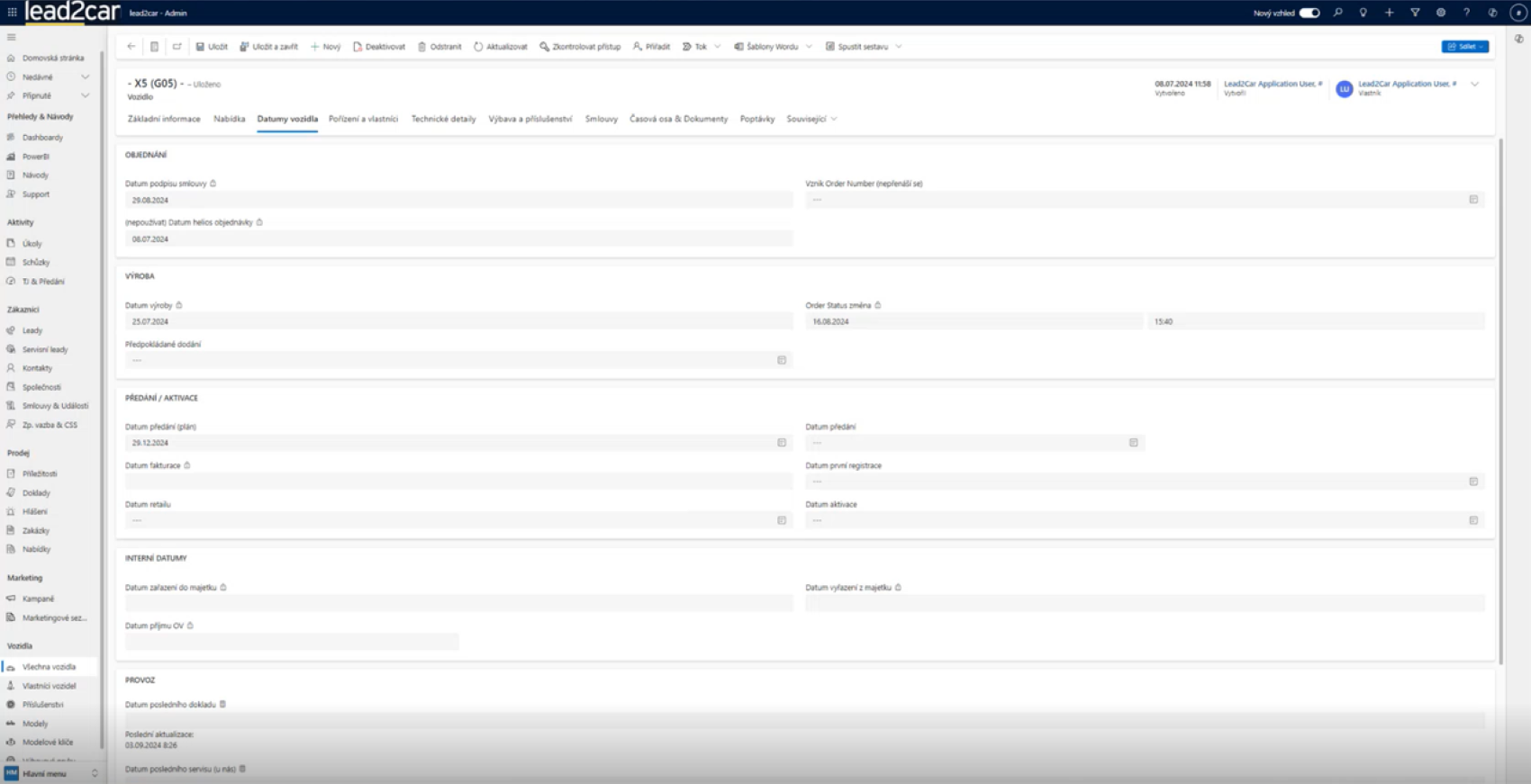 Data ohledně termínu dodání najdete v sekci vozidla pod záložkou "Datumy vozidla". Zde jsou uvedena data výroby, aktuální výrobní status a předpokládaný termín dodání vozidla. Pokud dojde k jakékoliv změně v těchto datech, systém automaticky vygeneruje upozornění, které je zasláno e-mailem dealerovi.