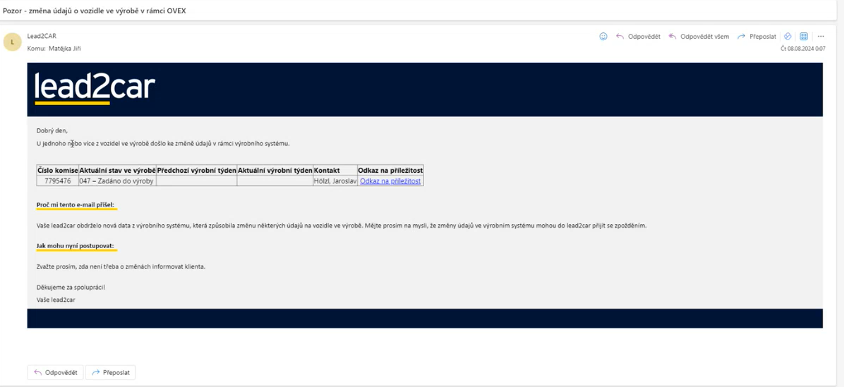 Tento návod popisuje postup komunikace s dealerem ohledně změn termínu dodání vozidla v systému Lead2Car. Při změně termínu nebo statusu výroby vozidla je automaticky generováno upozornění, které je zasláno dealerovi e-mailem.